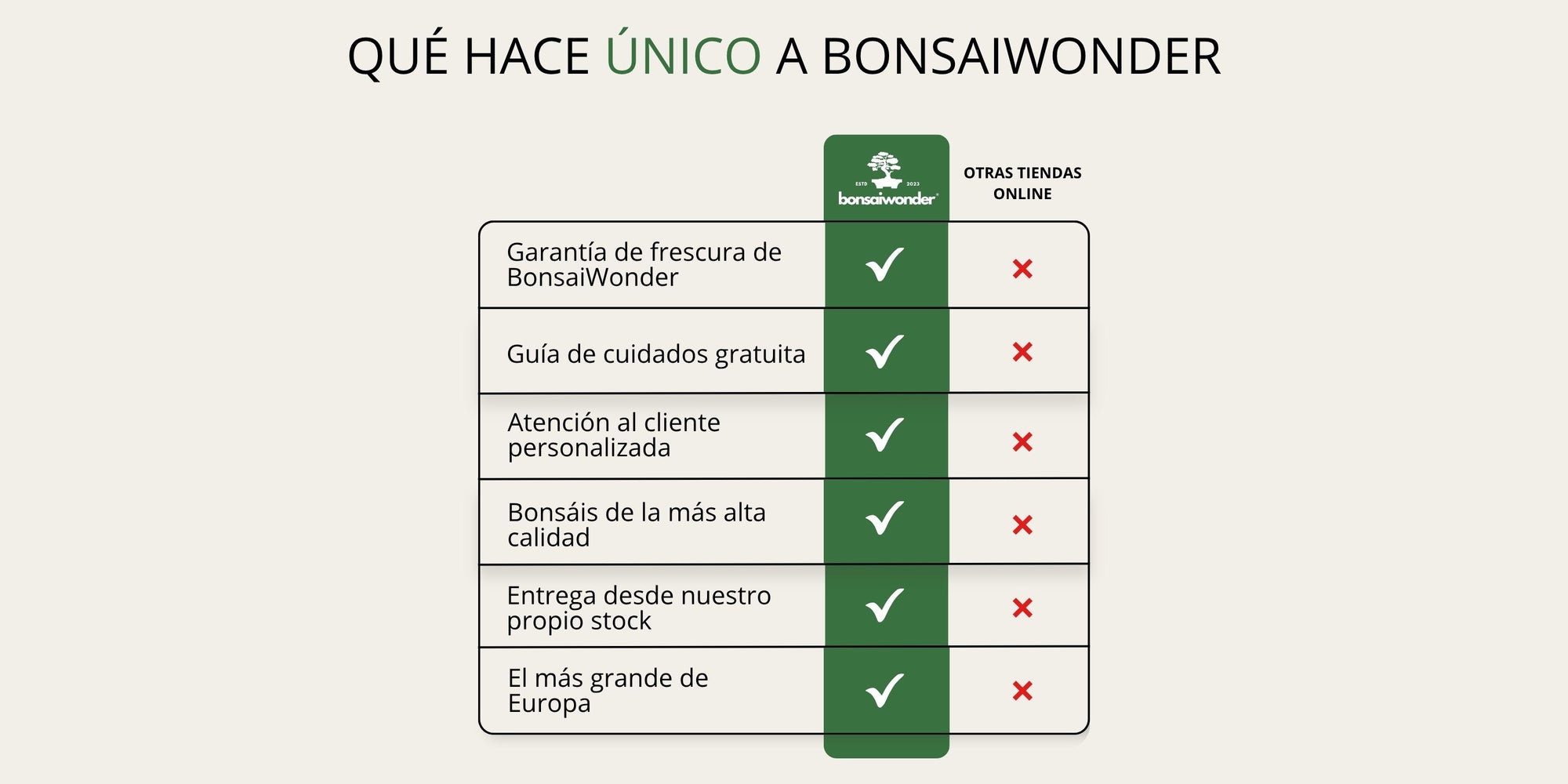 Creemos que con el cuidado adecuado, cualquiera puede cultivar un bonsái con éxito. Para reafirmar esta confianza, ofrecemos nuestra exclusiva "60 días Bonsaiwonder GarantíaDesde el momento en que recibamos su bonsái en su domicilio, le garantizamos una garantía de 60 días durante la cual le ayudaremos a cuidarlo. Si su bonsái muere durante este periodo, lo reemplazaremos sin coste alguno o le ofreceremos un cupón para usar en nuestra página web.