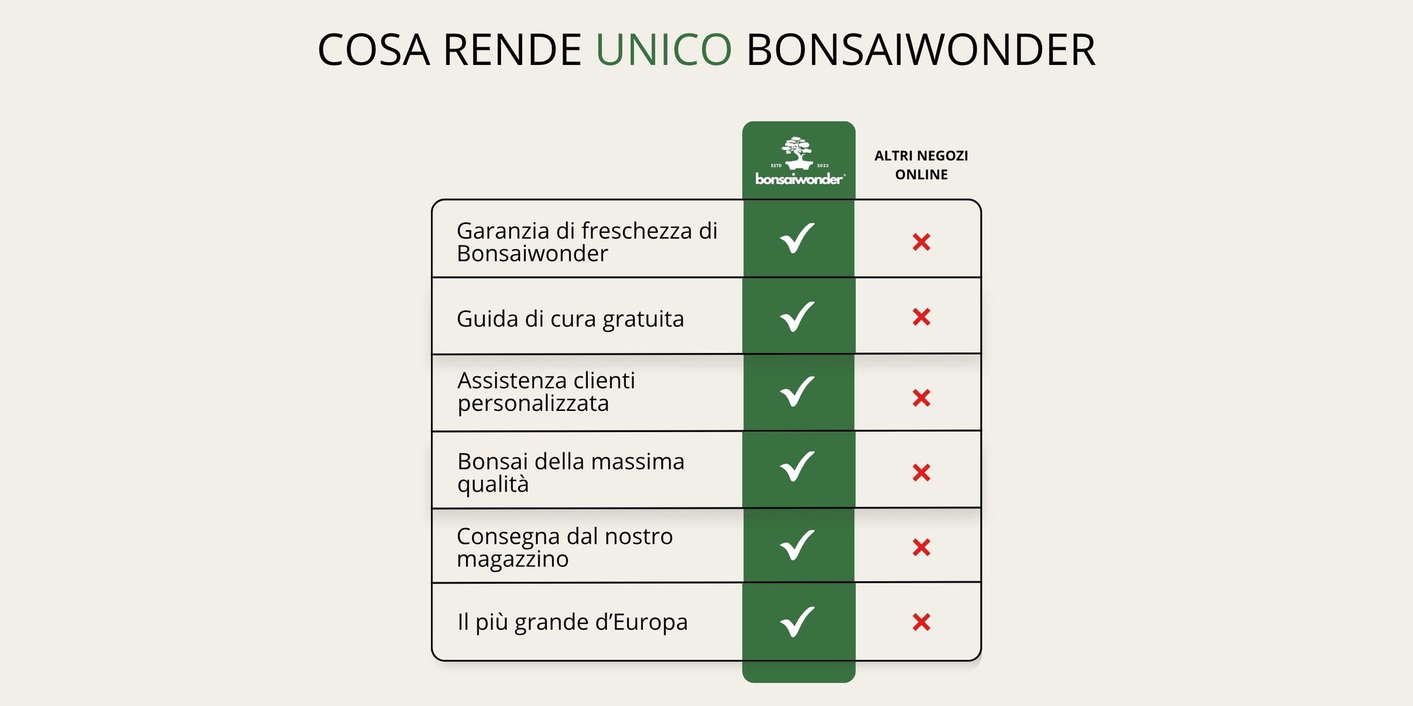 Crediamo che, con le giuste cure, chiunque possa prendersi cura con successo di un bonsai. Per confermare questa fiducia, offriamo la nostra esclusiva 'Garanzia Bonsaiwonder di 60 giorni'. Dal momento in cui il vostro bonsai viene consegnato a casa, avete diritto a un periodo di garanzia di 60 giorni durante il quale vi aiuteremo a prendervi cura del vostro bonsai. Se il vostro bonsai dovesse morire entro questo periodo, lo sostituiremo gratuitamente oppure vi offriremo un buono da utilizzare sul nostro sito web.