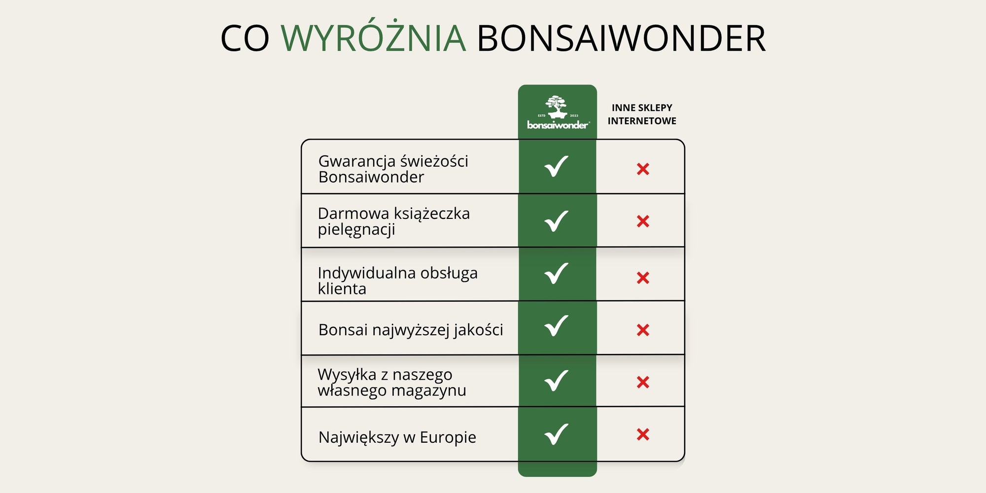 Wierzymy, że przy odpowiedniej pielęgnacji każdy może z powodzeniem uprawiać bonsai. Aby podkreślić tę pewność, oferujemy nasze wyjątkowe „60-dniowa gwarancja Bonsai WonderOd momentu dostarczenia Twojego bonsai do domu, masz 60-dniową gwarancję, w trakcie której pomożemy Ci o nie zadbać. Jeśli Twoje bonsai obumrze w tym okresie, bezpłatnie je wymienimy lub zaoferujemy Ci voucher do wykorzystania na naszej stronie internetowej.