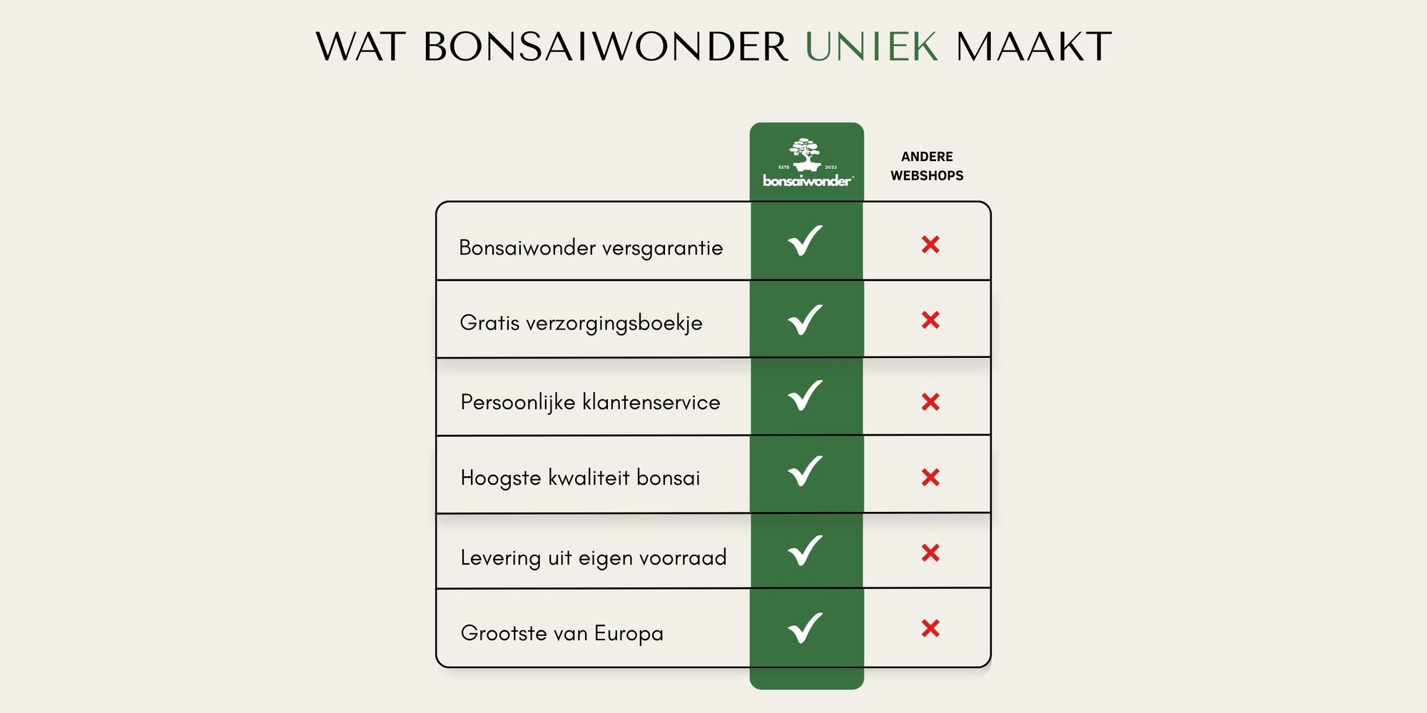 Wij geloven dat iedereen met de juiste verzorging succesvol een bonsai kan verzorgen. Om dit vertrouwen te onderstrepen, bieden wij onze unieke '60-dagen Bonsaiwonder Garantie'. Vanaf het moment dat uw bonsai bij u thuis wordt afgeleverd, bent u verzekerd van een 60-dagen garantieperiode waarin wij u zullen helpen met het verzorgen van uw bonsai. Mocht uw bonsai binnen deze periode dood gaan, dan vervangen wij deze kosteloos, of bieden we u een tegoedbon aan voor gebruik op onze website.
